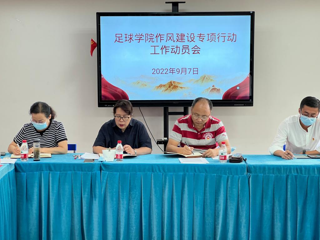 为深入贯彻落实干部作风建设,9月7日下午,足球学院在二号行政楼4楼会议室召开了作风建设专项行动工作动员会,足球学院全体教职工参加,会议由党总支书记姜梅主持。