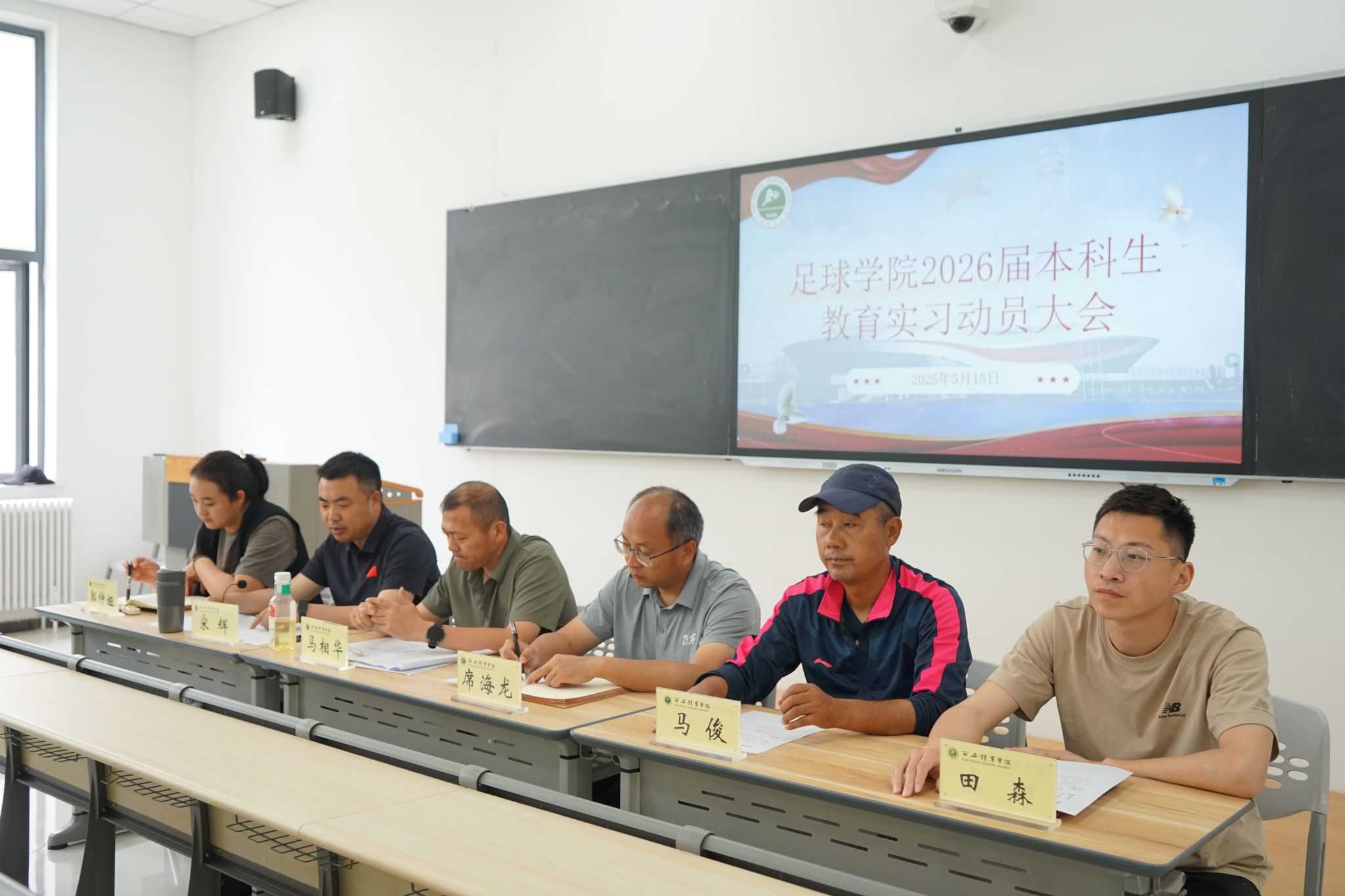 为全面部署学院本科生教育实习工作,明确实习任务,强化实践育人,积累工作经验、增强实践本领、提升就业能力,给即将踏上实习岗位的同学们鼓舞士气、指明方向,足球学院于2025年5月15日在鄠邑校区新教学楼106召开了2026届本科生教育实习动员大会。足球学院院长、副院长出席了会议,足球教研室主任、足球学院教学办公室主任、2022级辅导员、实习指导教师代表及全体2026届本科生参加了会议,本次会议由副院长马相华主持。