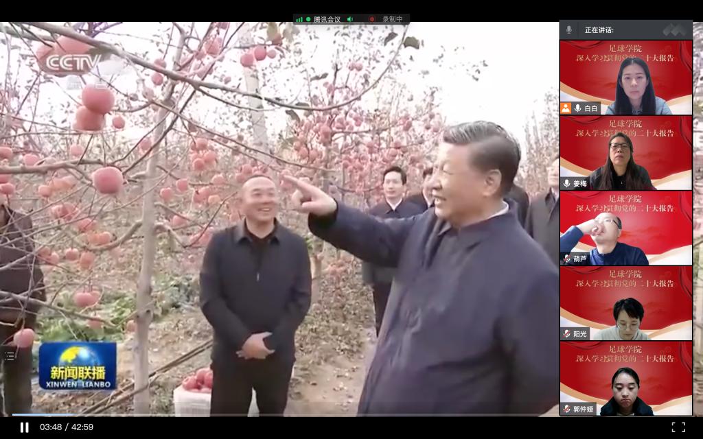 为深入学习贯彻党的二十大精神,11月2日下午,足球学院党总支理论学习中心组通过腾讯会议在线上进行了集体学习,会议由党总支书记姜梅主持。